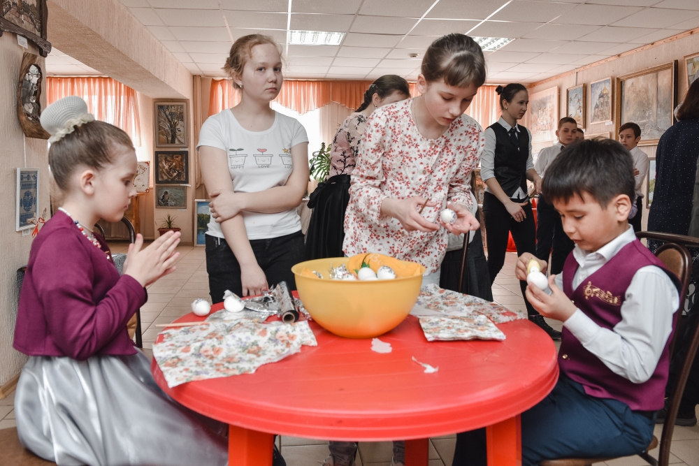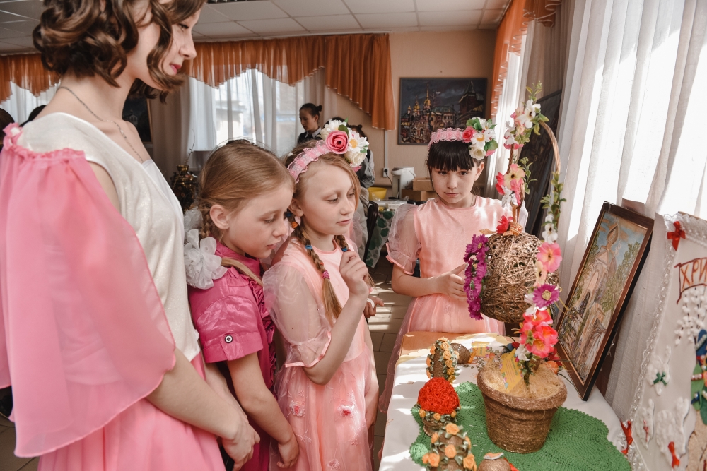 Перед торжественным открытием выставки состоялся мастер-класс для детей по украшению пасхальных яиц. Пока гости собирались для них звучали отрывки из классических музыкальных произведений в исполнении учеников Чесменской школы искусств.
