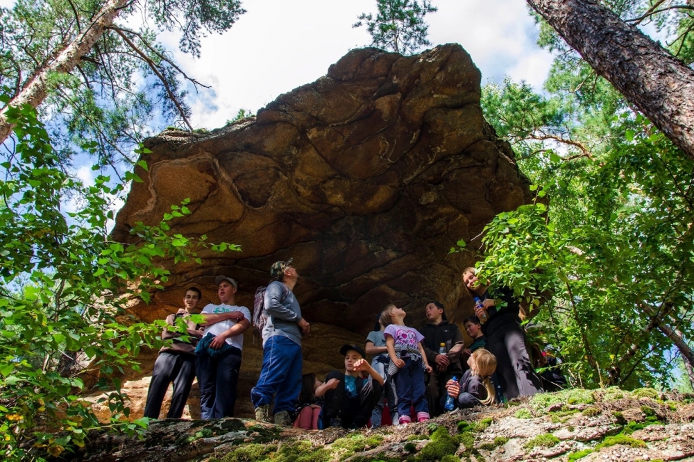 В первой части слёта школьники поднялись на хребет Змеиный по нестандартному, более длинному и красивому маршруту, изобилующему останцами выветривания, лишь отчасти покрытыми лесом, матрацевидным и глыбовидным отдельностям с многочисленными каменными навесами, гротами и пещерками с их своеобразной флорой.