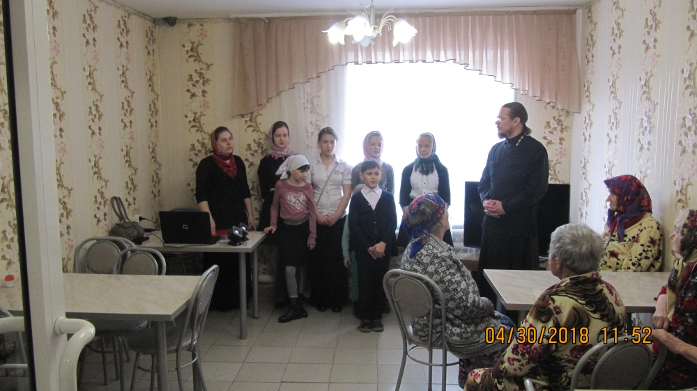 Посещение пожилых людей с концертами и совместным чаепитием является доброй традицией, которая уже существует несколько лет. В этот раз ученики Воскресной школы приехали поздравить бабушек и дедушек с Пасхой, с праздником жен-мироносиц и наступающим Днем Победы.